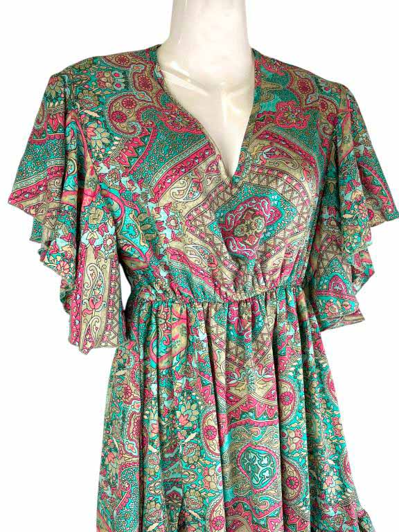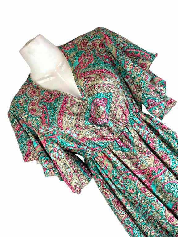 Vestido Artesanal de Seda India con Cuello en V, Alegre Diseño y Talla Única para Mujer. Fabricado en India.