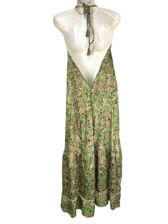 Vestido Largo Artesanal con Bonito Diseño en Seda India de Mujer con Espalda Descubierta, Tirantes, Escote y Talla Única. Fabricado en India.