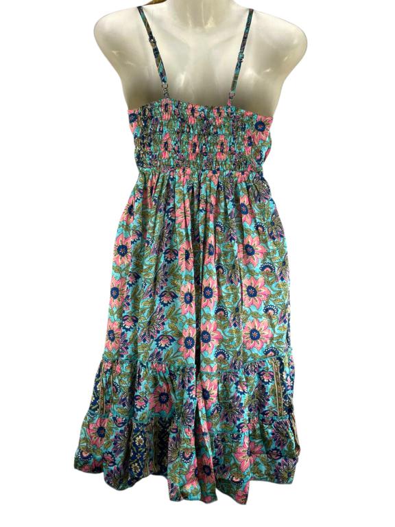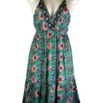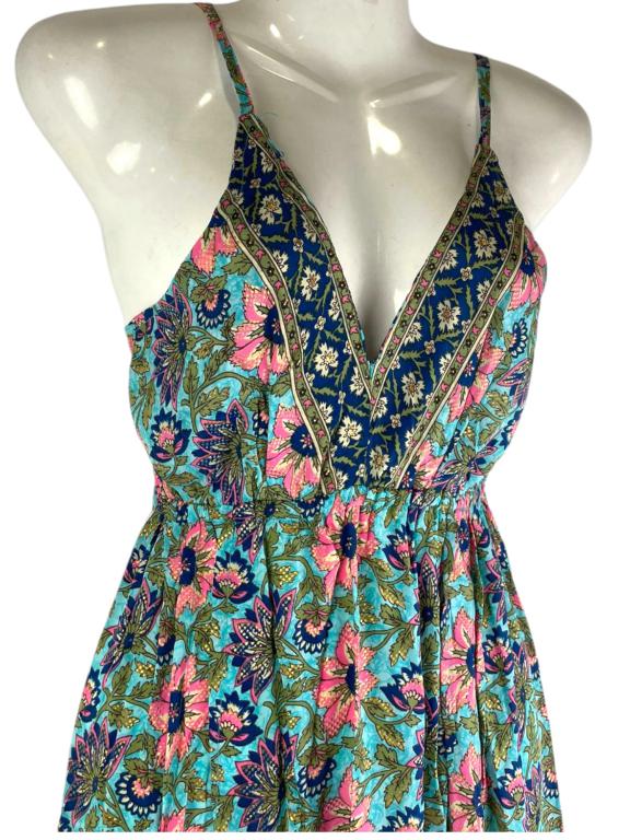 Vestido Largo Artesanal en Seda India con Diseño de Flores, Tirantes, Cuello en V y Espalda Descubierta para Mujer. Fabricado en India.