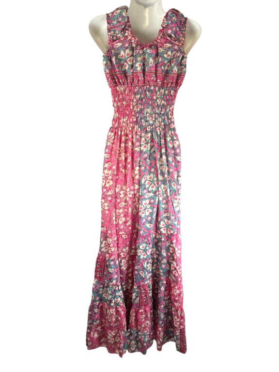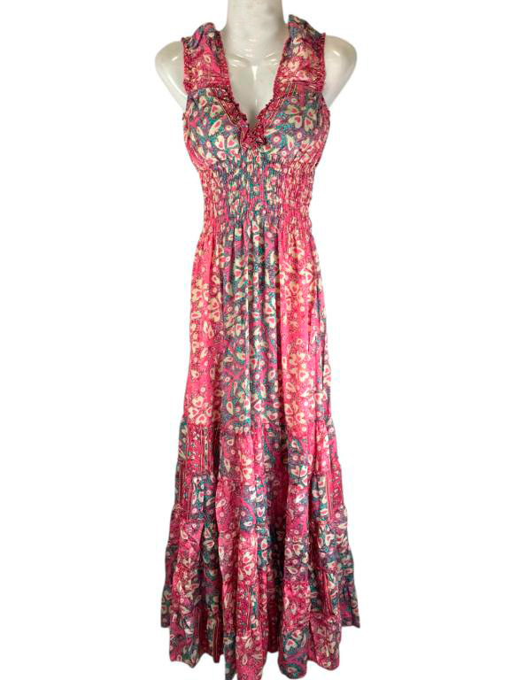 Vestido Largo Artesanal en Seda India con Escote con Volantes y Talla Única para Mujer. Fabricado en India.
