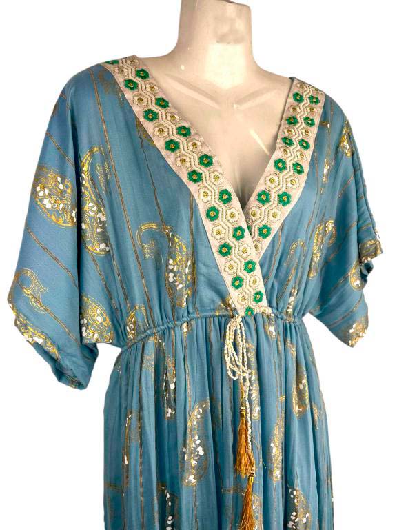 Vestido Largo Artesanal Estilo Boho para Mujer con Mangas, Cuello en V y Gran Calidad. Fabricado en India.