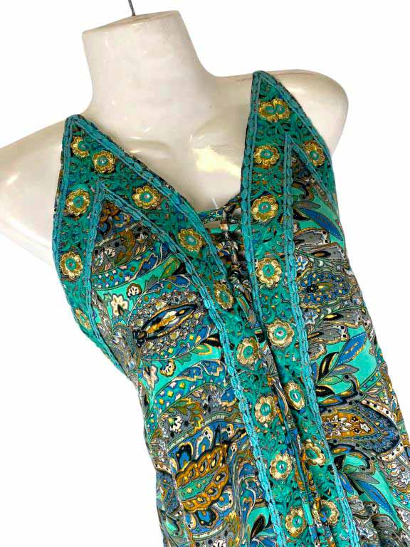 Vestido Multicolor Largo Artesanal para Mujer en Seda India con Cuello en V, Tirantes y Espalda Descubierta.